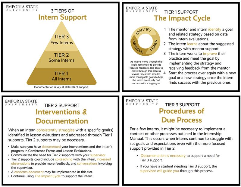 Mentors can have concerns with interns for various reasons: dispositional, pedagogical or practical, and/or content knowledge. An intern might have a single concern that needs to be addressed or various concerns that need to be addressed. Similar to the tiers of the RtI process, we follow a 3-Tier System. Most interns will be successful with Tier 1, but a few may need further Tier 2 and Tier 3 assistance.